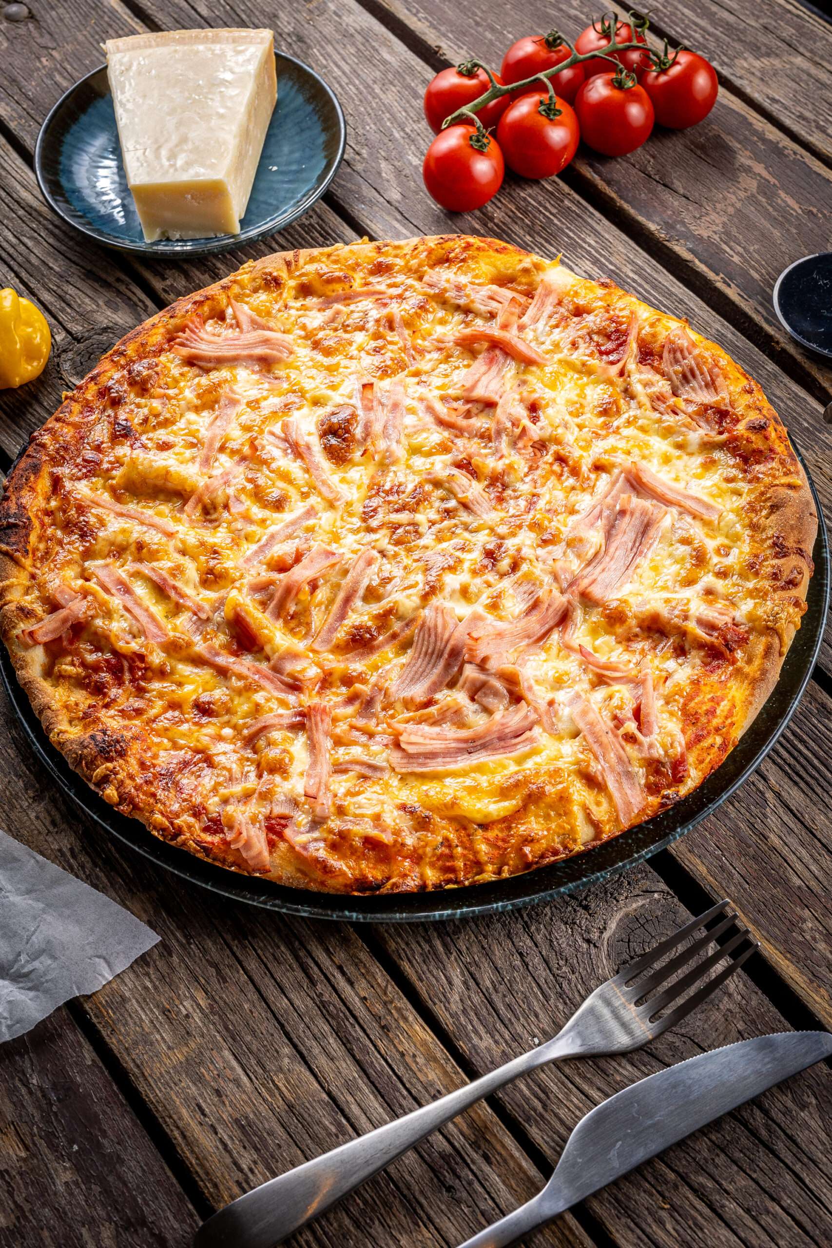 mustáros alap, kolbász, csirke, füstölt sajt, pepperoni, bacon