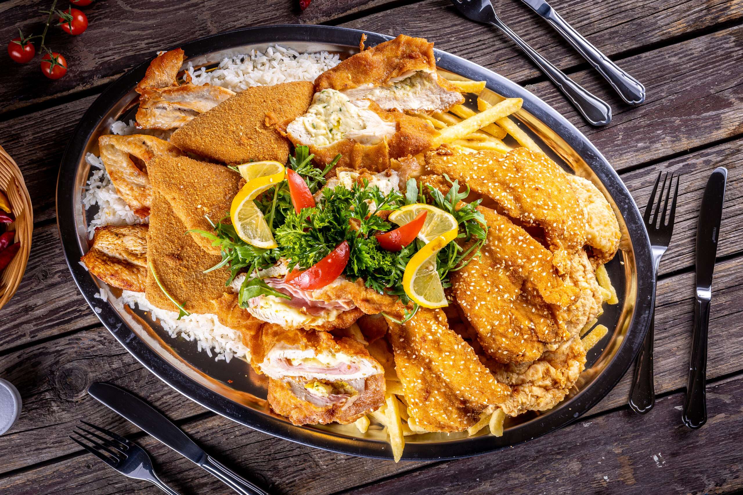 3 db grillezett csirkemellszelet, 3 párizsi szelet, 3 db szezámmagos szelet, 3 db rántott sajt, 1 db Cordon Bleu, 1 db kijevi csirkemell, 2 adag hasábburgonya, 2 adag rizs, savanyúság