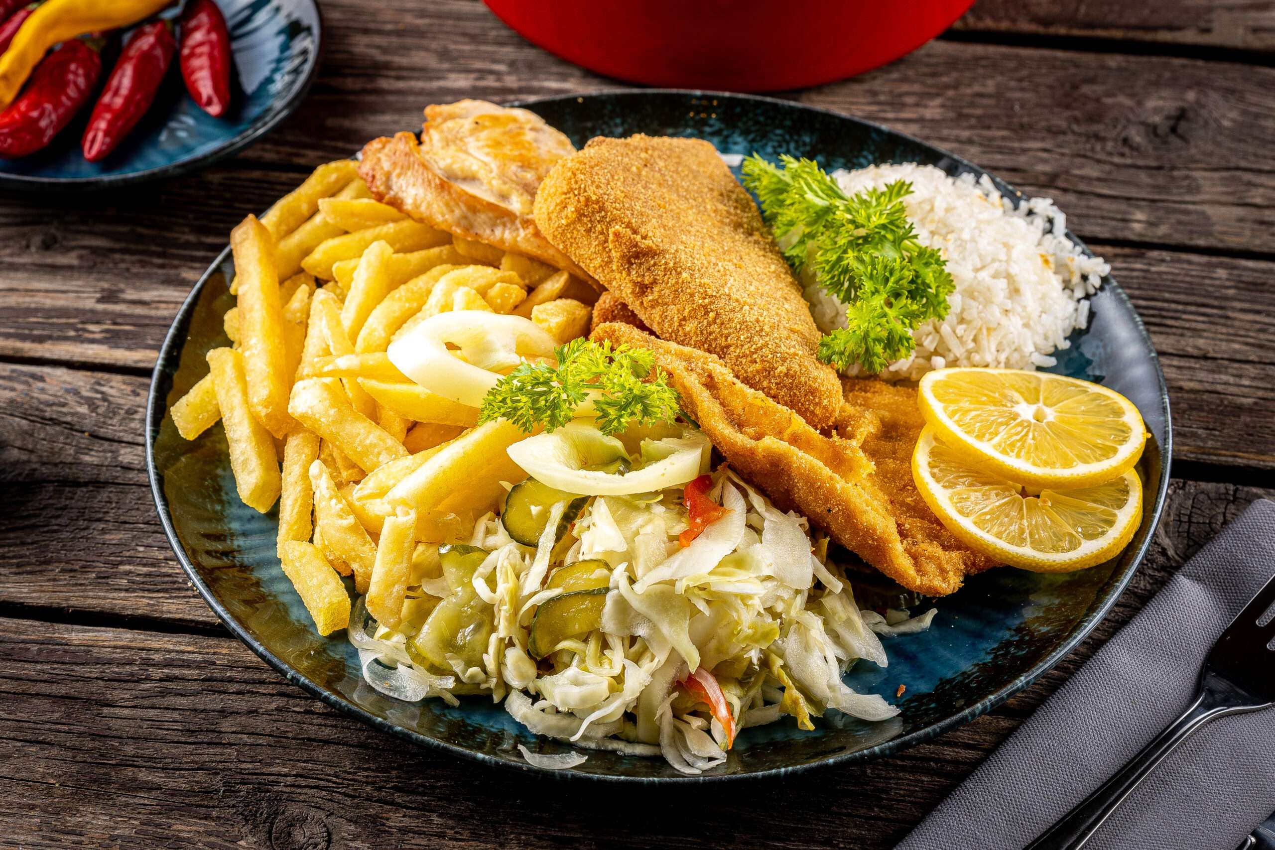 rántott csirkemell, grillezett csirkemellszelet, rántott sajt, vegyes köret, savanyúság