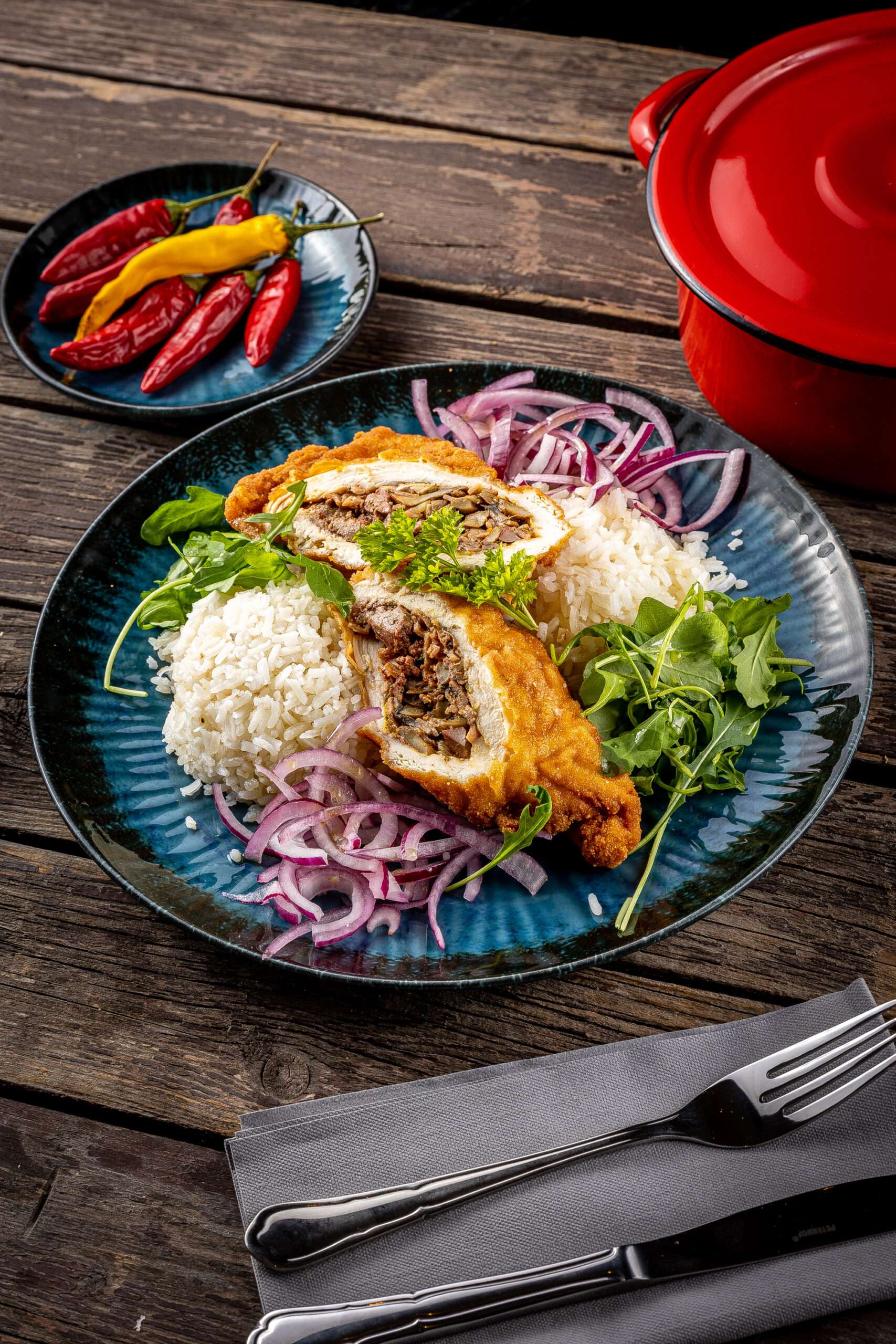 gomba, sonka, csirkemáj csirkemellbe töltve, lila hagymával