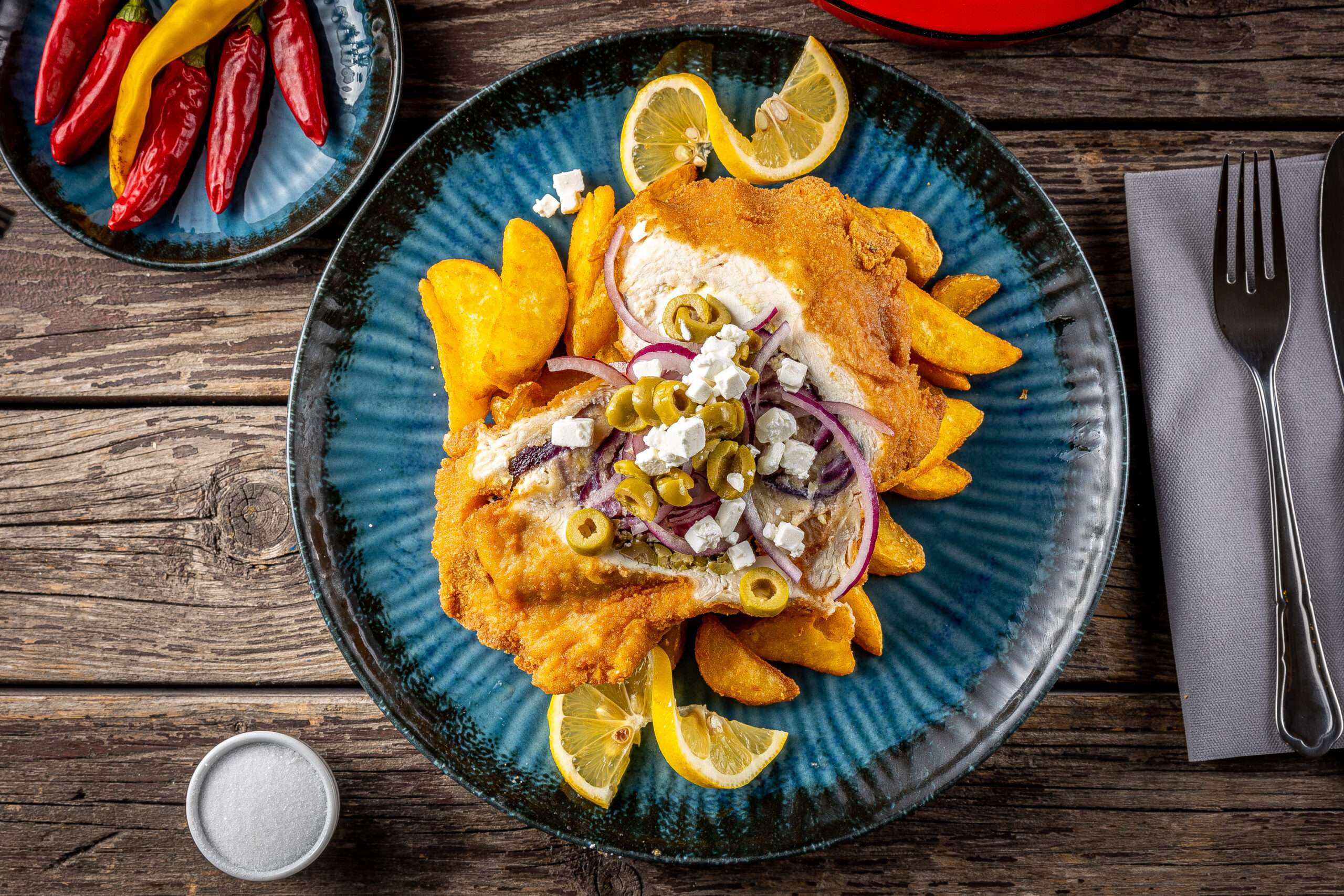 kemencében sütve, paradicsomkarika, lila hagyma, feta sajt, olívabogyó, sajt