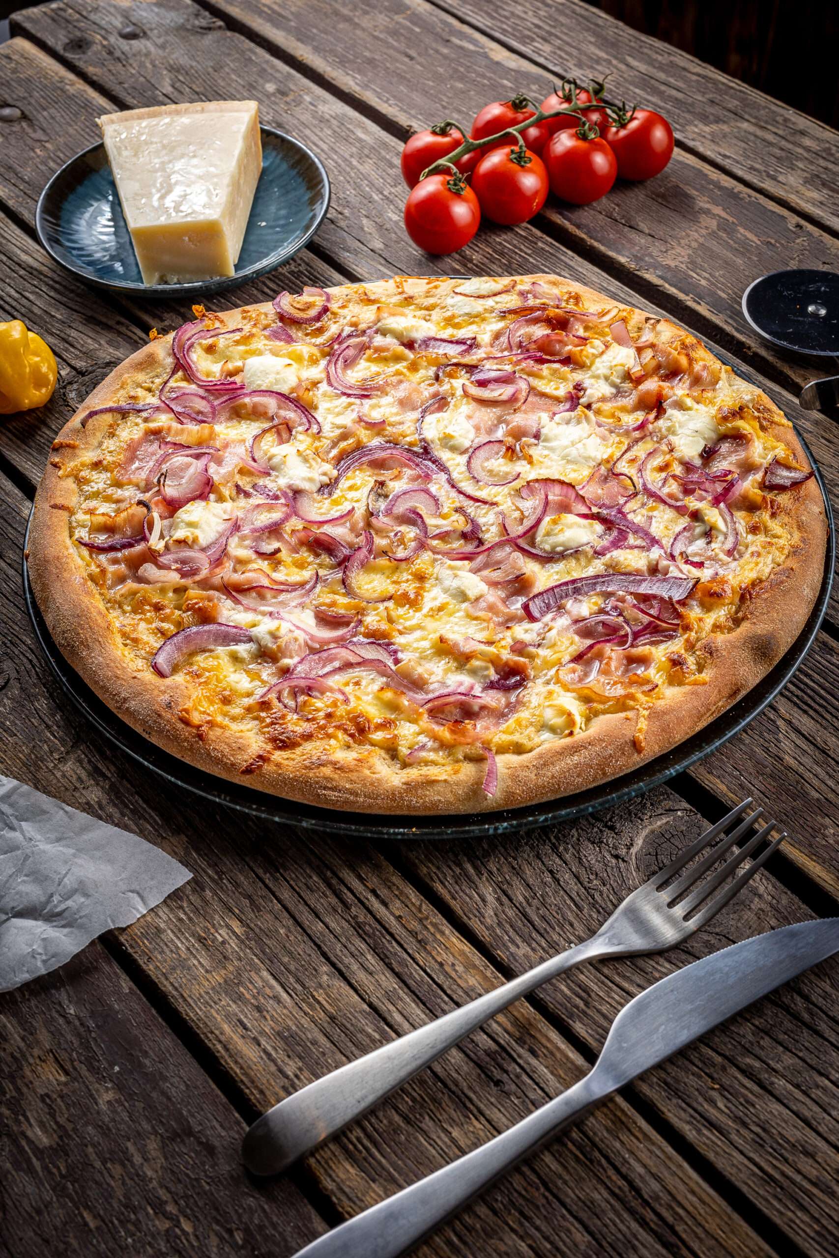 fokhagymás tejföl, juhtúró, lila hagyma, bacon, sajt
