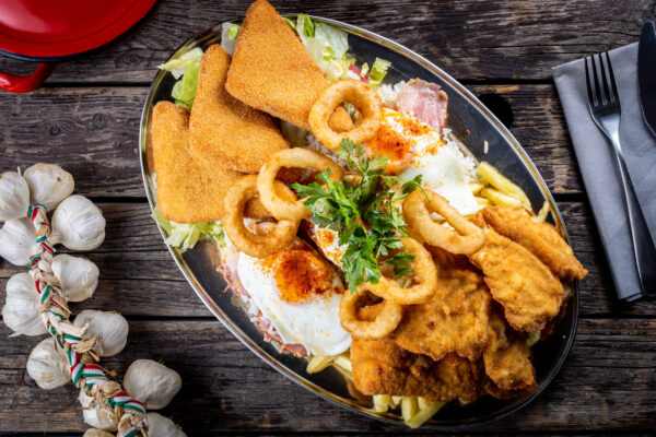3 db sajt, 3 db rántott csirke, 3 db grillezett csirkemellszelet baconnel, 3 db tükörtojás, zöld saláta, rántott hagymakarika, hasábburgonya, rizs, tartármártás