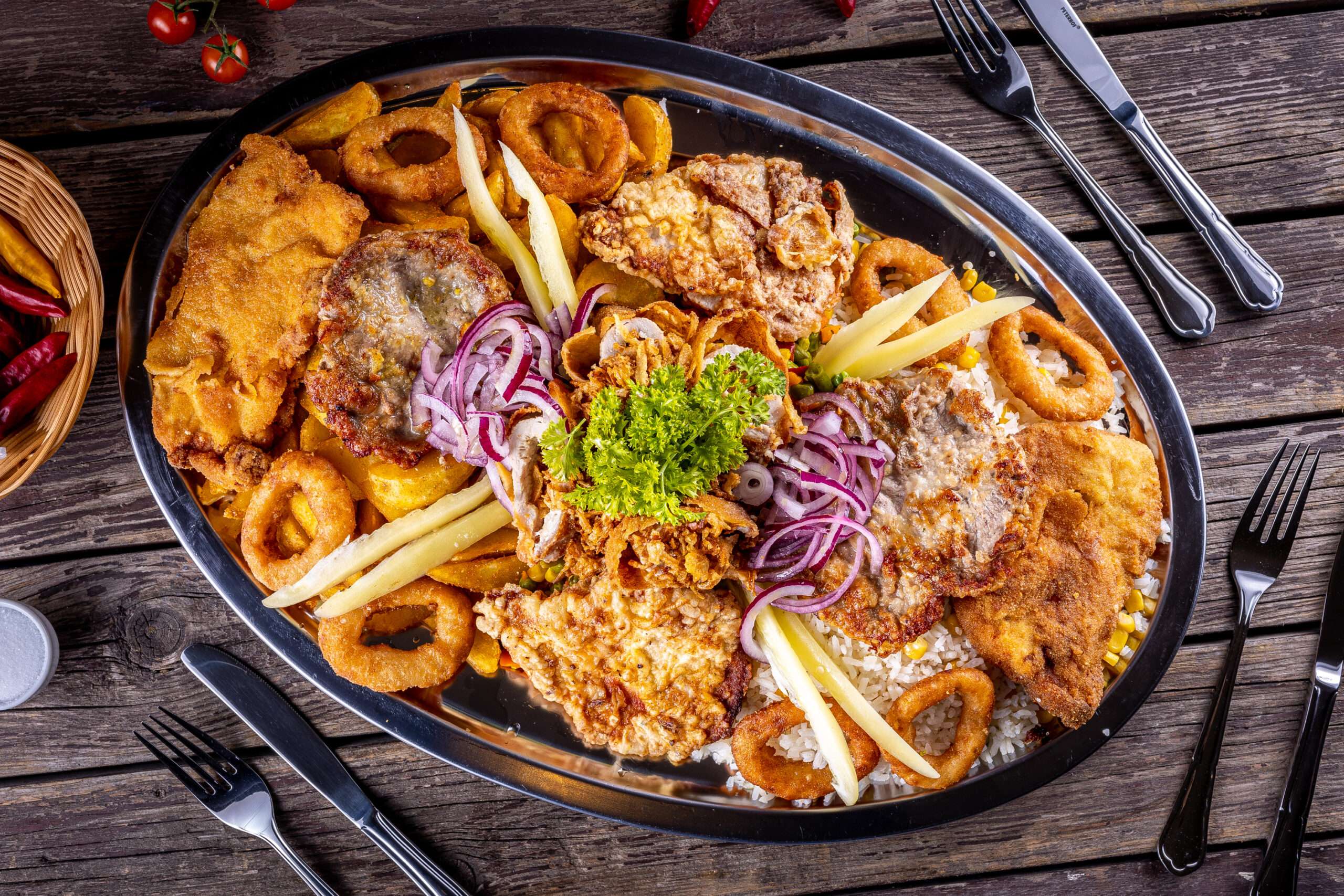 2 db juhtúróval töltött karaj, 2 db párizsi szelet, 2 db rántott karaj, 2 db grillezett tarja, 8 db hagymakarika, kukoricás rizs, steakburgonya, párolt vajas zöldség