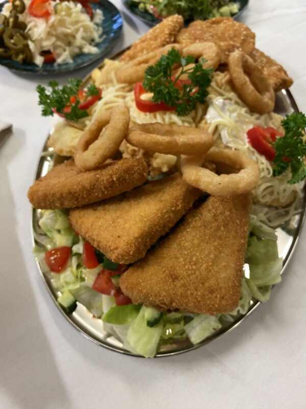 Három darab mátrai borzaska, három szezámos csirkemell, három rántott trappista, hat hagymakarika vegyes saláta, rizs és hasáb körettel.