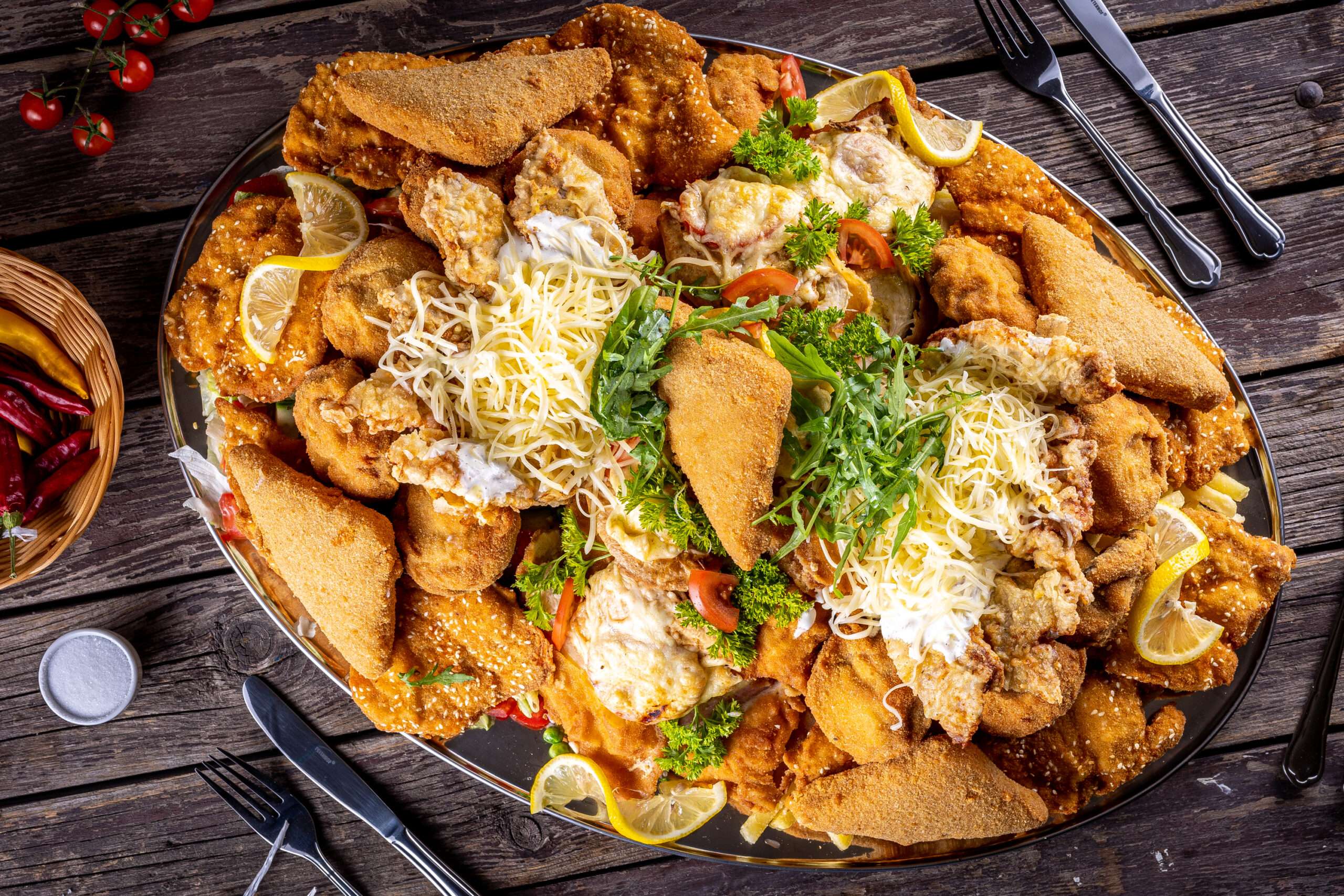 5 db cordon blue, 10 szelet szezámos jércemell, 5 db mátrai borzaska sertésből, 5 db san marinói csirkemell, 10 db rántott gombafej, 5 db rántott trappista sajt, rizi-bizi, hasábburgonya, friss saláta