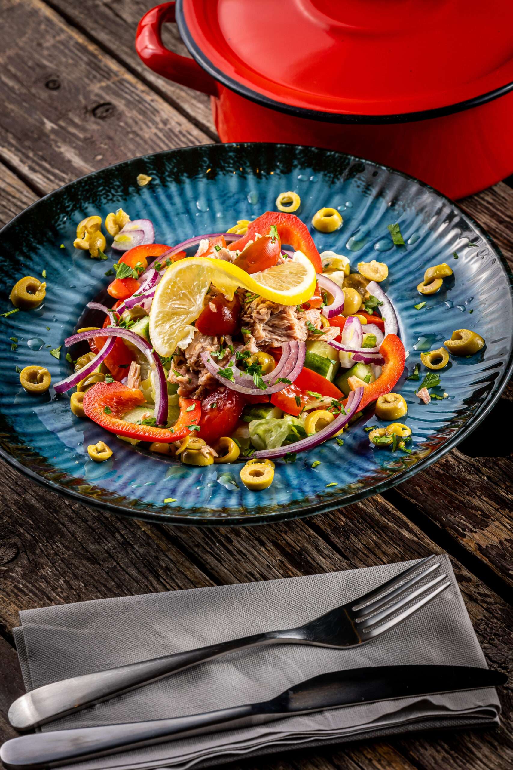 uborka, friss saláta, paradicsom, tonhal, olívabogyó, olívaolaj