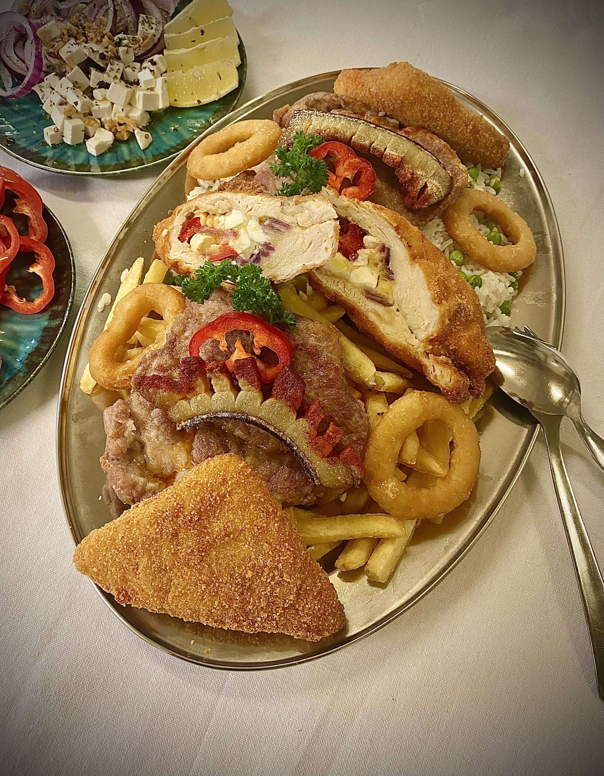 Két szelet cigány pecsenye kakastaréjjal, fetával kápiával töltött jércemell, két trappista sajt, négy hagymakarika, rizi-bizi, hasábburgonya körettel.
