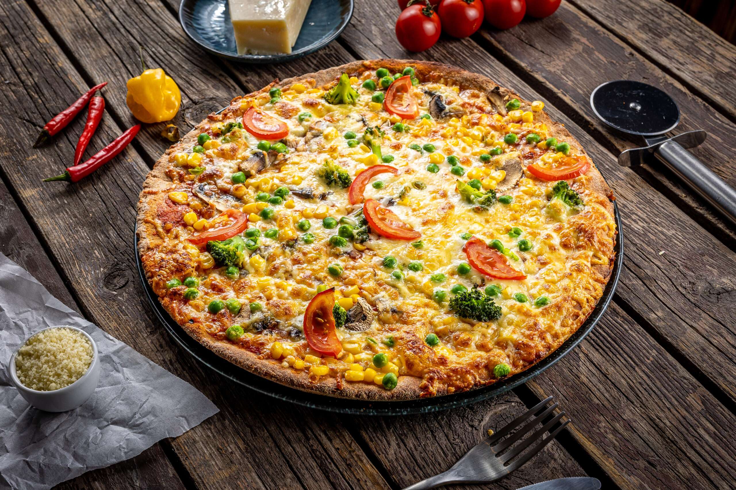 paradicsomszósz, brokkoli, borsó, kukorica, paradicsomkarika, gomba, sajt