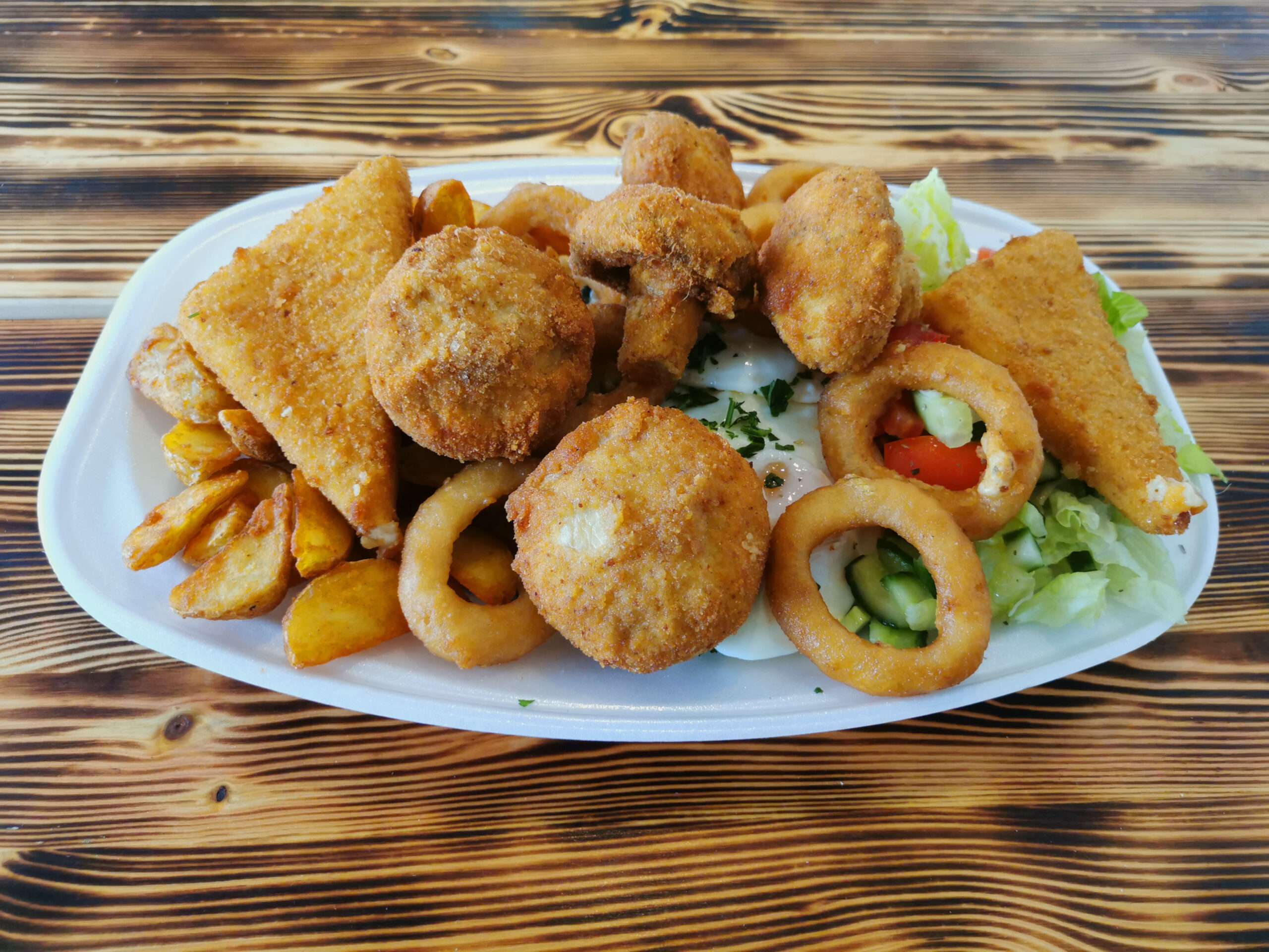 2 db rántott sajt, 4 db gomba, 8 db hagymakarika, majonézes kukorica, 2 db tükörtojás, zöld saláta, steakburgonya